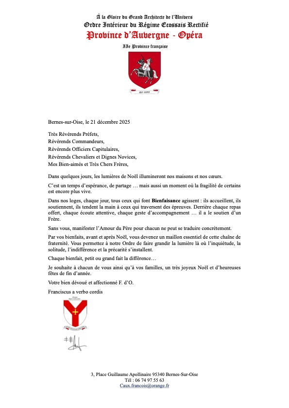 Province d'Auvergne - Opéra Grand Prieuré de Provence Notre Dame de la Garde La Patente La Préfecture On ne peut rien apprendre aux gens. On peut seulement les aider à découvrir qu'ils possèdent déjà en eux tout ce qui est à apprendre Très Révérend Préfet i.o. eques cor fidelem Les actualités Les dernières invitations sont disponibles ici : flash Infos Les Voeux du Révérendissime Maître Provincial Les textes de références MESA NOVICE CBCS Les règlements Province Prieuré Préfecture